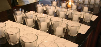 we had each of our guests light a votive candle and place it on their reception table of choice.